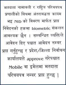 जिल्ला निर्वाचन कार्यालय काठमाडौंका प्रमुख ठाकुर प्रसाद भट्टराईले भने, “राष्ट्रिय परिचयपत्र भएकाले अनलाइन फारम भरे पुग्छ। तर, परिचयपत्र नभएकाले भने बायोमेट्रिकका लागि कार्यालय आउनैपर्छ।”