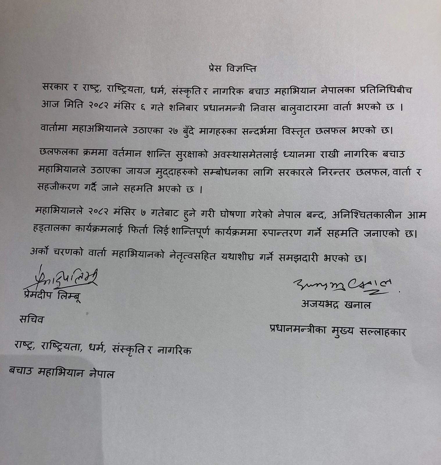 प्रधानमन्त्री निवास बालुवाटारमा शनिबार राति भएको वार्तामा दुई पक्षबीच सो सहमति जुटेको हो। वार्तामा महाअभियानले उठाएका २७ बुँदे मागका सन्दर्भमा विस्तृत छलफल भएको थियो।