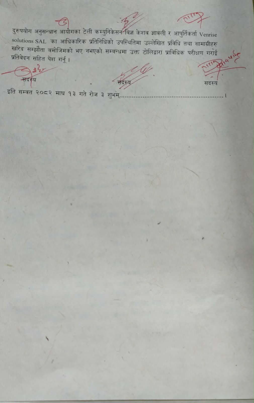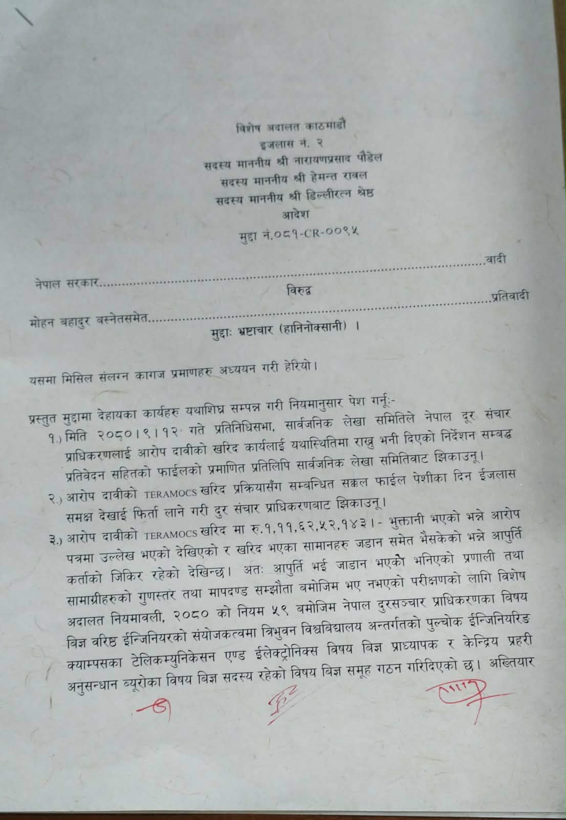 विशेष अदालतका सदस्यहरू नारायणप्रसाद पौडेल, हेमन्त रावल र डिल्लीरत्न श्रेष्ठको संयुक्त इजलासले तीनबुँदे आदेश जारी गर्दै उच्चस्तरीय विज्ञ टोली गठन गर्न भनेको छ। अदालतले नेपाल दूरसञ्चार प्राधिकरणले खरिद गरेका सामग्रीहरू सम्झौता बमोजिम भए/नभएको अध्ययन गर्न निम्न सदस्यर रहने गरी टोली बनाउन आदेश दिएको छ ।